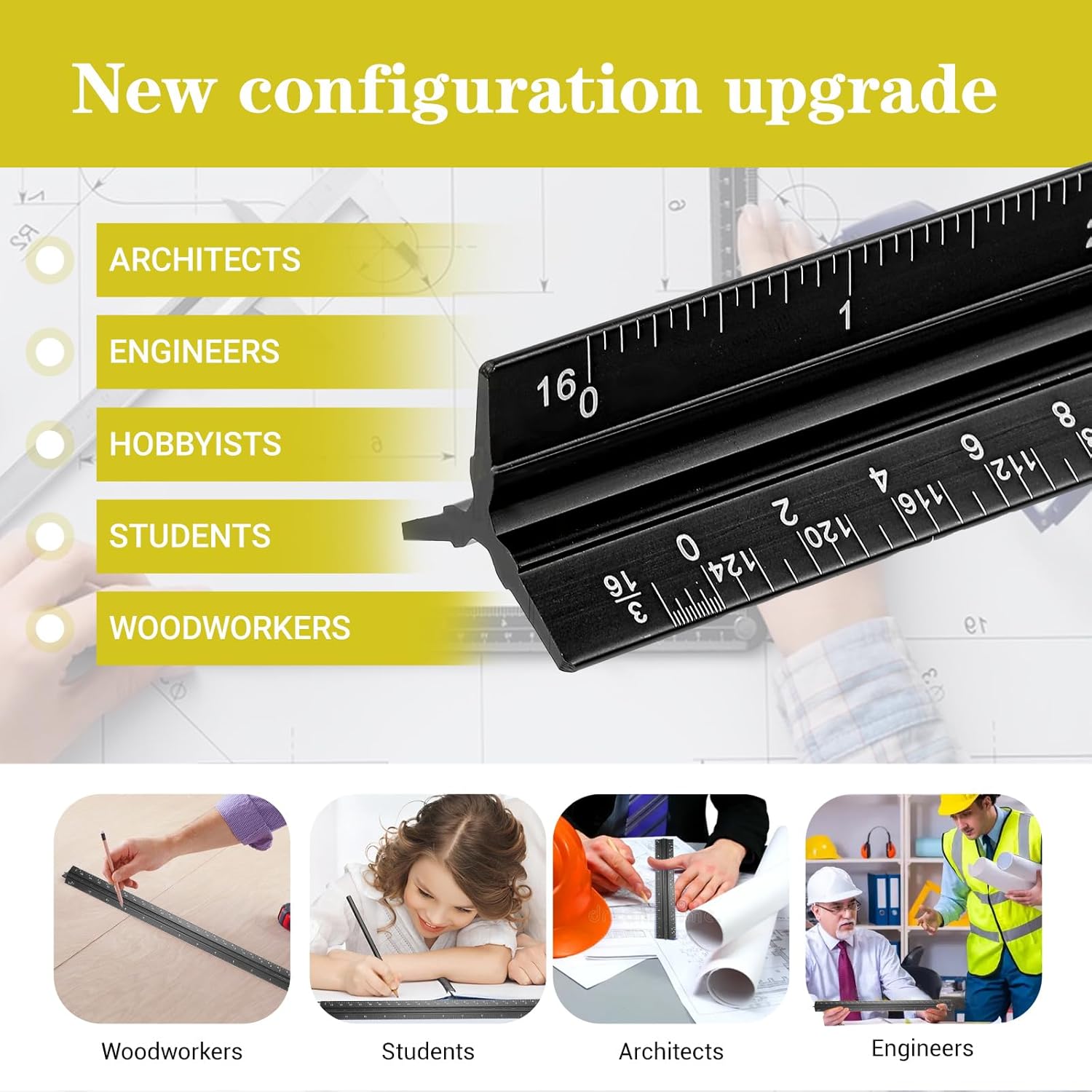 Features:Sufficient Quantity with Protection: You get 10 architect triangle drafting rulers (12.8x1x1inch/32.5x2.55x2.25cm), each with a plastic cover to prevent tearing and soiling. The ample count meets daily use and replacement needs for drafting tasks.Durable Build & Precise Markings: These architectural scale rulers are made of high-quality anodized aluminum alloy—sturdy, anti-break, anti-deform, and color/shape-retaining. The architect triangular scales have laser-etched marks for clear readability and accurate blueprint measurements.Versatile & User-Friendly: As engineering scale rulers, they have triple-sided scales (1-1/2", 1, 3/4", etc.) for various architectural/drafting projects. As blueprint measuring tools, their smooth, burr-free surfaces keep hands safe, ideal for technicians, engineers and more.Specification: Style: ProfessionalPurpose: Tight measuring toolColor: BlackMaterial: Aluminum AlloyDimensions: 12.8 x 1 x 1 inch / 32.5 x 2.55 x 2.25 cmPackage Included: 10 pcs Imperial Metal Triangle ScalesNote: Dimensions are manually measured, please allow slight variations.Colors may vary slightly depending on screen display.