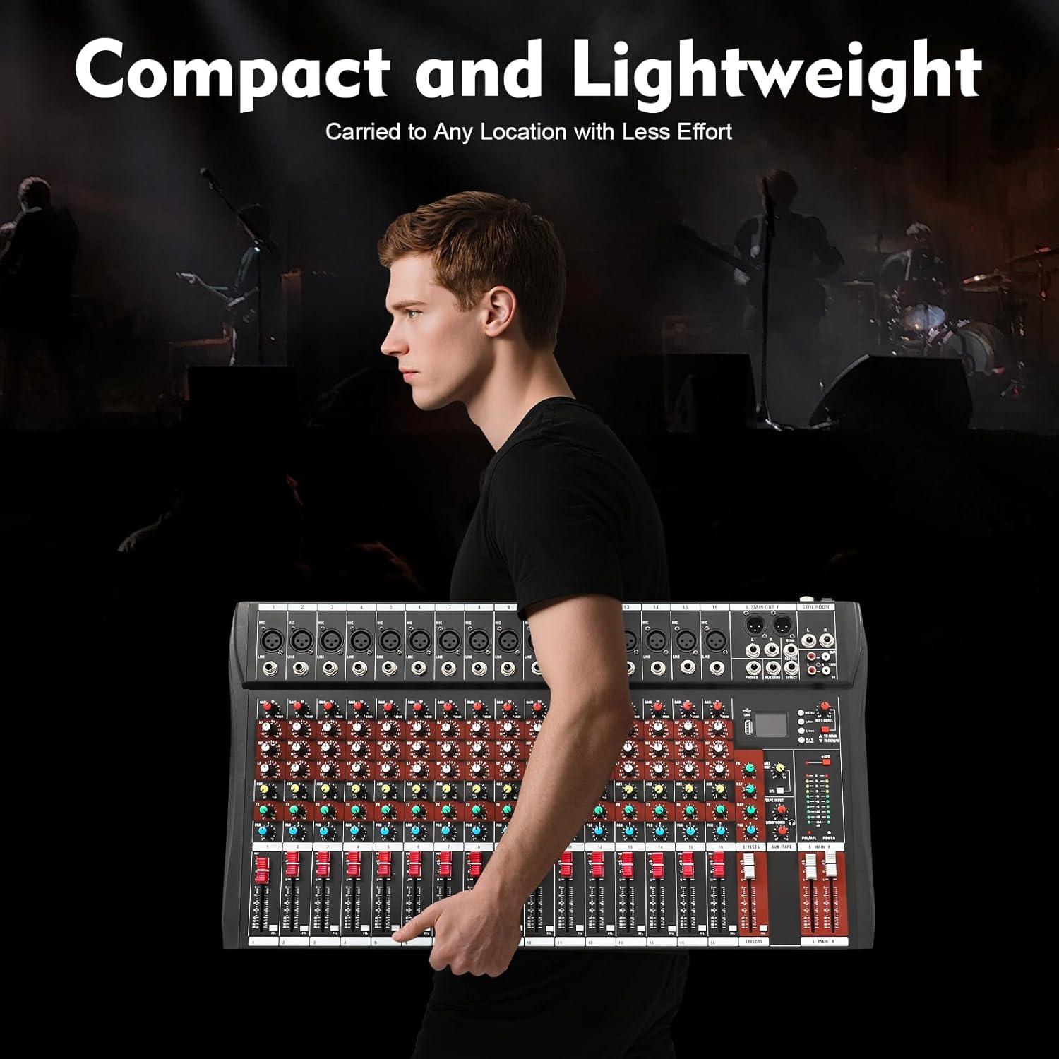 Description:A versatile 16-channel audio mixer can give you a professional-grade listening feast and enjoy an amazing musical atmosphere. With high-precision audio resolution and accurate vocal adjustment, it can make the sound delicate and full. Its simple operation and high compatibility make it suitable for a variety of scenes.Features:Tuning Partner: It is equipped with high-precision 20Hz-30kHz frequency response to ensure professional sound quality. It can also be connected with Bluetooth, computers, tablets, etc. to provide you with mobile karaoke or music production functions!48V Phantom Power: When you use condenser microphones that need to be powered up (not included) to create an auditory feast as well as drive the live atmosphere, this phantom power with higher frequency and sound quality is available to you.Easy to Operate: Its simple and easy-to-use control panel and bright LED screen allow you to easily get started and become a professional mixer!Compact and Lightweight: Because of its compact size(25*13.39*1.46 inches) and lightweight(14.66 lbs), you can easily carry and store it.Specification:Color: BlackMaterial: MetalMounting Type: TabletopAssembly Required: NoPower Source: CordedPlug Type: US Standard Adapter Input: AC100-240V, 50/60Hz, 2A(MAX)Adapter Output: DC8V, 2ANumber of Channels: 16Max. Input Level: +24dBu(MIC/Line)Max. Output Level: +26dBu(XLR)Main Level Meter: 10 Segment LED, -24dB to CLIPFrequency Response: 20Hz to 30KHz ±0.5dBMax. Input Power: 15WTotal Wave Distortion(THD+N): <0.01%(Channel Input to Mix Output)Crosstalk(1kHz): >85dB(Fader Off); >82dB(Inter Channel)Noise (22Hz to 22KHz): Equivalent Input Noise -122dBu, Residual Output Noise <-90dBuMono/Stereo Channel EQ: High Frequency, Broom Type, +/-15dB, 12KHz; Low Frequency, Broom Type, +/-15dB, 80KHz; Hi-Mid Frequency, Peak Valley Type, +/-15dB, 2.5KHz2-track Return: RCA, Unbalanced, 4K ohm, -2dBu2-track Send: RCA, Unbalanced, <75 ohm, -2dBuL/R Output: XLR Unbalanced, Tip Hot, <75 ohm, +4dBu, Max.+22dBuFX/AUX Output: TRS, Unbalanced, Tip Hot, <75 ohm, -2dBu, Max.+18dBuHeadphones: TRS, Tip L, Ring R, 30 to 600 ohm Headphones RecommendedMono Channel:XLR Balanced, Pin 2 Hot, 2K ohm, Sensitivity -60 to +14dBuTRS Balanced, Tip Hot, 10K ohm, Sensitivity -40 to +14dBuXLR Phantom Power + 48VProduct Size: 63.5*34*3.7cm/25*13.39*1.46 inPackage Size: 67*12*43cm/26.38*4.72*16.93inGross Weight: 7kg/15.43lbsNet Weight: 6.65kg/14.66lbsPackage Included:1* 16-channel Audio Mixer1* Power Adapter1* English Manual