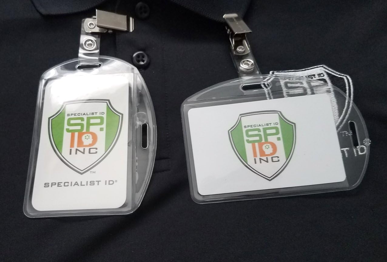 Better than pins that poke, or magnets that can cause complications or fall off. More economical and less annoying than lanyards or retractable badge reels. These long lasting reusable combo kits feature heavy duty crystal clear transparent identification prox / proxy card covers, and work with both vertical and horizontal orientation and are held to your clothing with super secure universal clear badge straps with powerful closure force that don’t leave a mark on your dressy clothes. These clips can attach to your lapel, collar, pocket, purse strap, your lanyard’s cord or key ring (if you’ve already got a lanyard), even the bill of your hat!! These are great for the whole team and for any organization, because even if your photo ID badge design, software, or even your JOB….. you can still keep using the same badge holders! Great for managers, Human Resource Departments (HR) and Purchasing Managers, knowing that year after year as things change, your badge holders won’t have to. With it’s durability and versatility you can go longer before needing a replacement. Pre punched holes allow for easy connection to any neck lanyard or retractor you already have. Top loading vertically and secure side load when used horizontally. Completely transparent, both signal and bar codes are readable through the material, but If you have a magnetic stripe time card, you can easily remove your card and insert without unnecessary sealing. Available package sizes include 5, 10, 25 and bulk 100ct