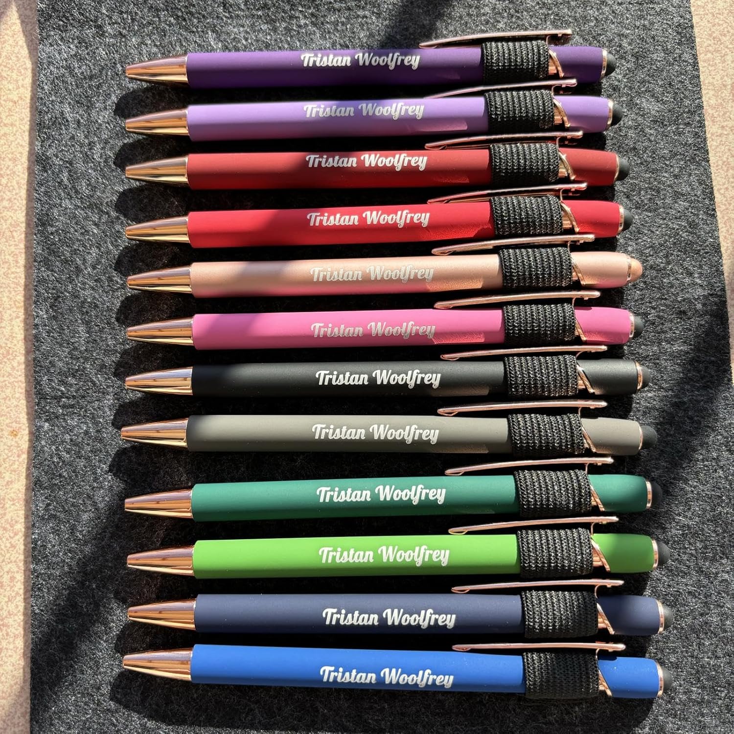 These custom ballpoint pens make a great personalized gift or promotional item.Featuring a choice of 10 colors and custom text or logo engraving, they can be tailored to represent your brand, celebrate an occasion, or show someone you care. The fine 1.0mm tip lays down smooth, dark lines for easy writing, while the included stylus allows for touchscreen use. Sleek yet durable, these pens will be a welcome addition to any desk, backpack, or briefcase. Whether you need business gifts, party favors, or a thoughtful present, these customized ballpoints are a quality option that will get used daily.