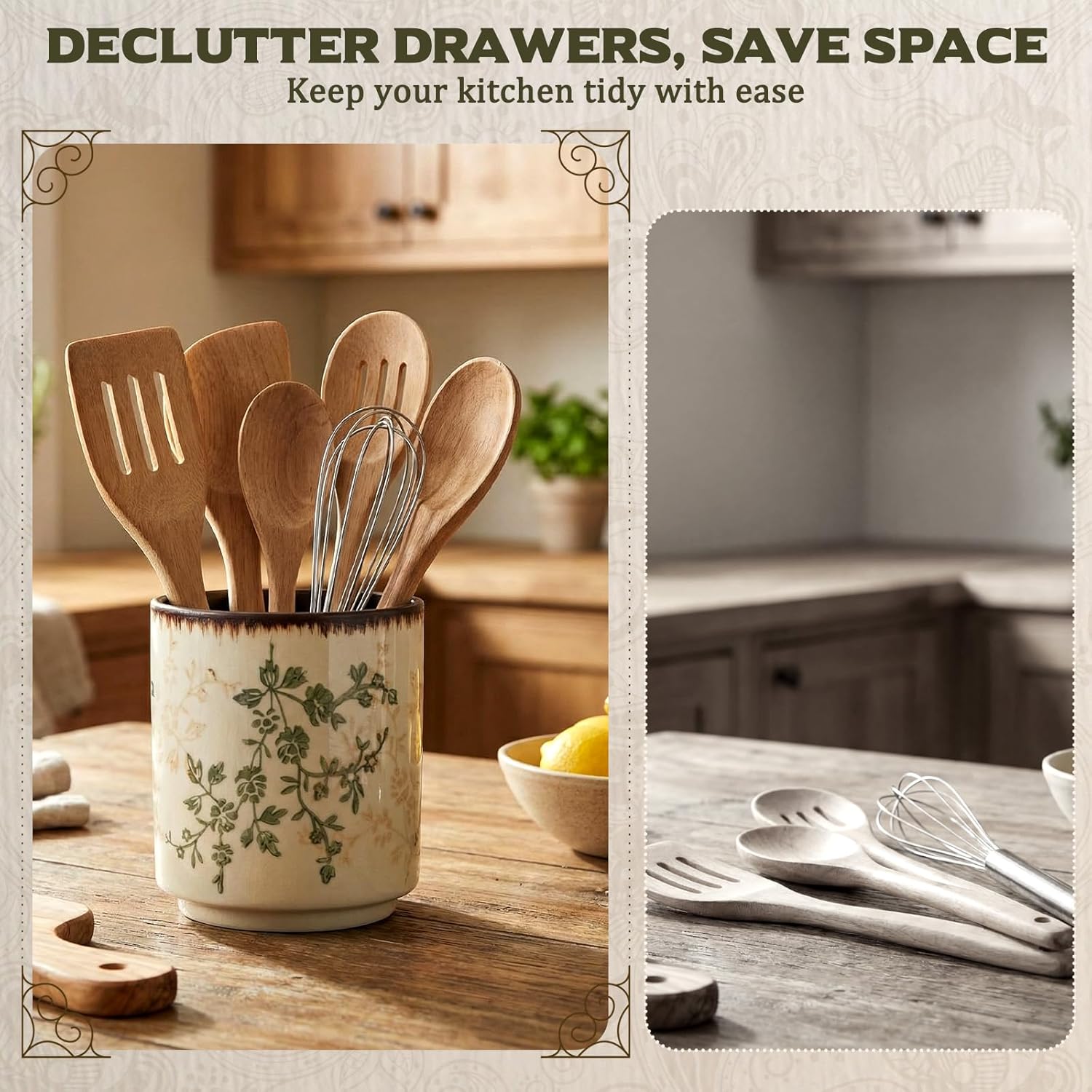Features: Tuscany ceramic utensil holder offers a rustic and elegant design, nice for organizing utensils on your kitchen counter. Elegant ceramic kitchen organizer blends functionality with style. Made of durable ceramic, it keeps your kitchen utensils organized while adding a beautiful touch to your kitchen or dining area. Specifications: Material: ceramic Color: green brown and white Size: 5.5 x 4.7 x 4.7 inches Package includes: 1 x Ceramic utensil holder Notes: Manual measurement, please allow slight errors on size. The color may exist a slight difference due to different screen displays Tuscany ceramic utensil holder should not be washed in a dishwasher. To maintain its crackle glaze finish, it's best to clean it by hand using a soft cloth and mild soap. This will help preserve its beauty over time
