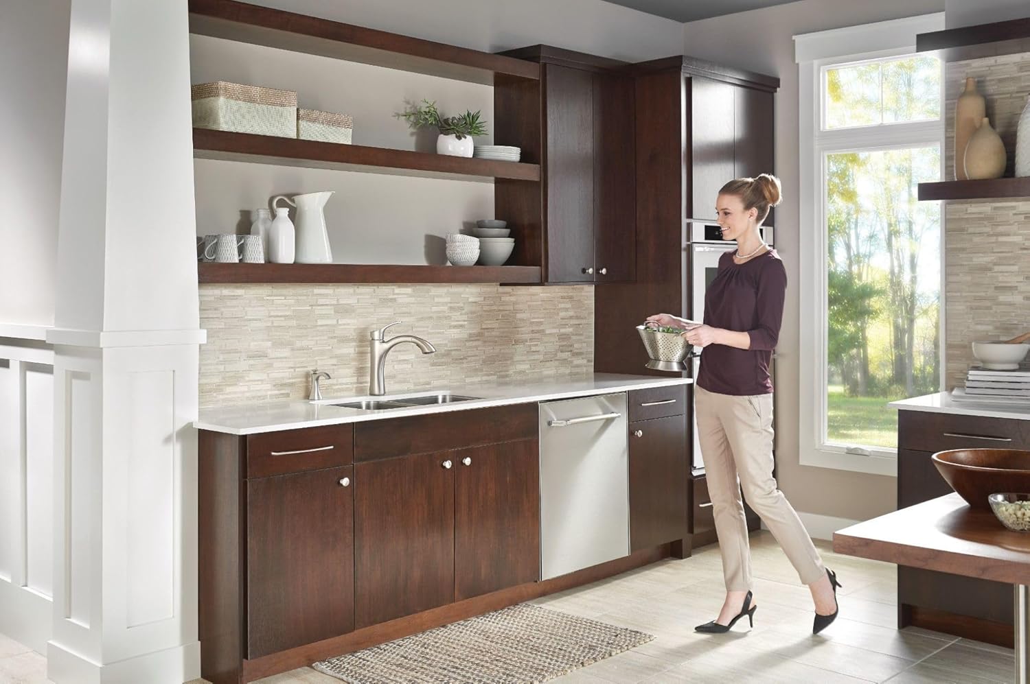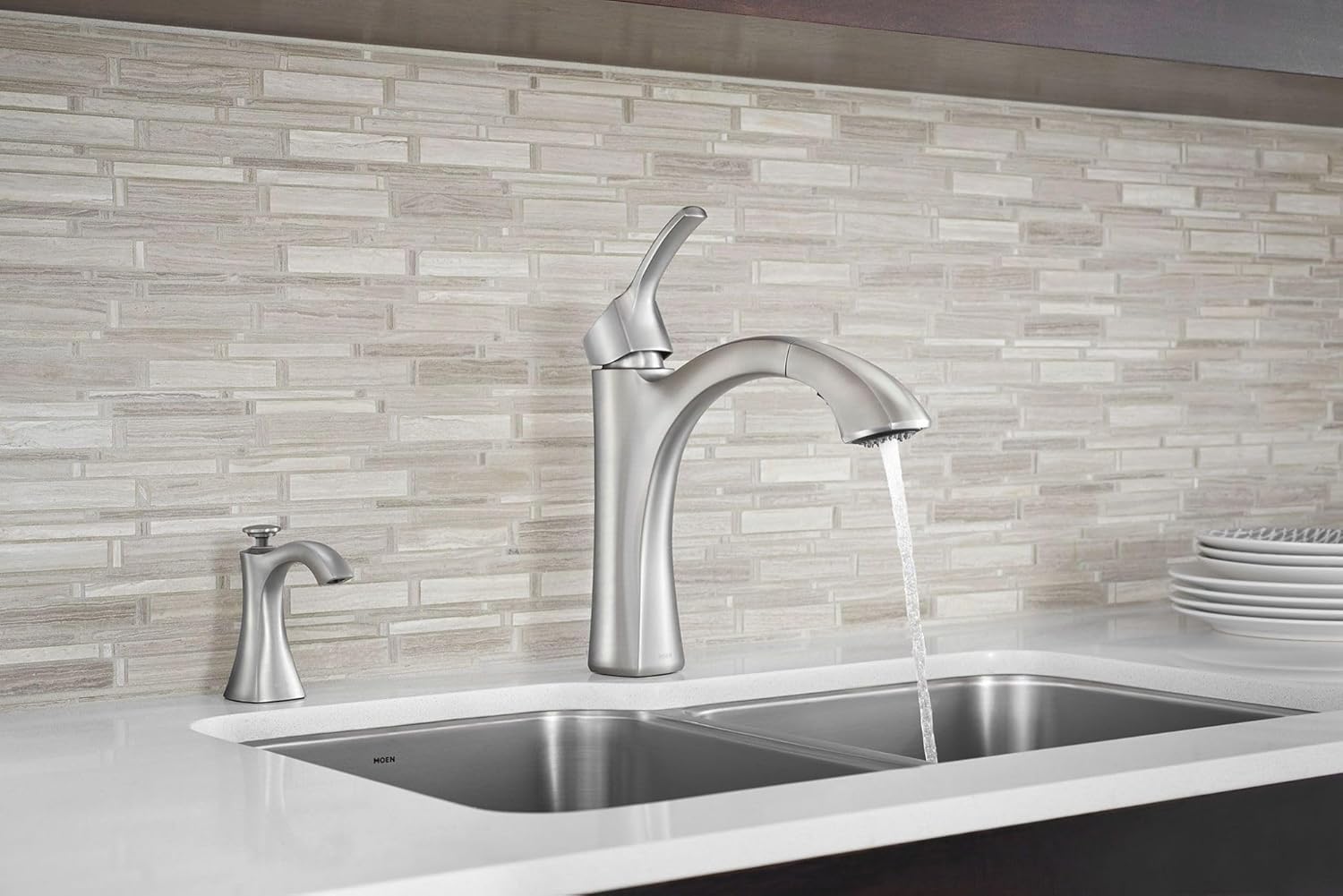 Product Description Dispense soap directly from your kitchen sink with the Moen Transitional Kitchen Deck Mounted Soap Dispenser. This built-in soap dispenser refills easily from the countertop and offers a clog-resistant pump, wide tapered body with squared edges, and a curved spout for generous reach. The deck-mounted dispenser requires only one hole for installation and includes a refillable 18-ounce bottle. Its Spot Resist stainless finish resists fingerprints and water spots to keep your kitchen looking cleaner. It is backed by Moen's Limited Lifetime Warranty. From the Manufacturer Modern, traditional or transitional - however you define your faucet's style, you can assure a coordinated look with Moen soap dispensers. Available in a variety of styles, with all the finish choices you need, the finish is a perfect match to your kitchen faucet.