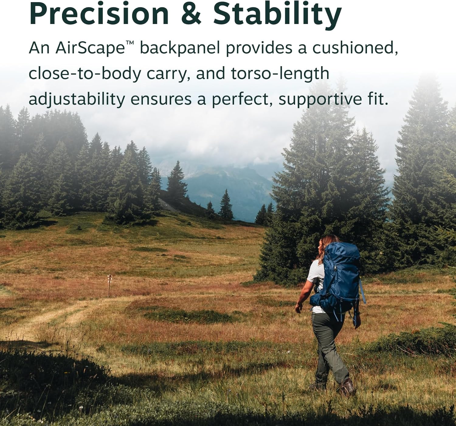 A rugged, streamlined take on the classic rucksack, this pack offers an adjustable women's fit and ample volume for overnights and short multi-day trips. An AirScape™ backpanel delivers cushioned, close-to-body comfort, while torso-length adjustability dials in the fit. Stash essentials in front shove-it and hipbelt pockets, plus a hidden side zipper to the main compartment. Raincover included.